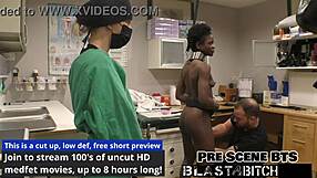 Black nurse jackie banes humiliates patient with latex gloves and handcuffs backstage