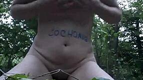 Whore slut performs outdoor autoseance in forest