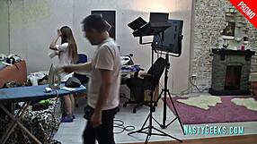 Behind the scenes with Bettie Hayward, a mature college girl, during photoshoot in stockings