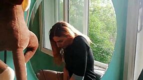 while testing the sybian toy the blonde feels an urge