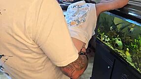 while the husband drinks coffee, his wife rides her friend's fist and cock in the bathroom for a creampie dump