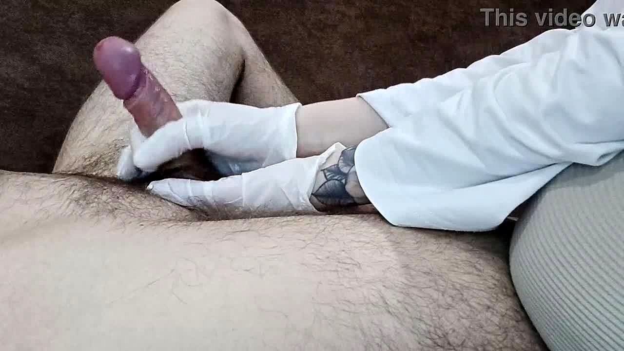 Femdom mistress in latex gloves milks lactating nurse tits while giving dirty talk handjob to big cock patient in hospital fetish scene.